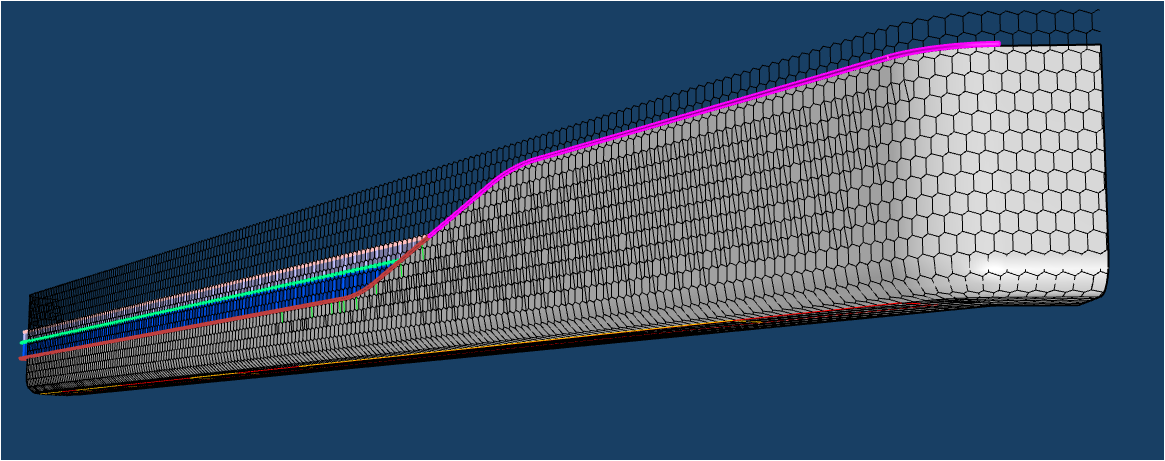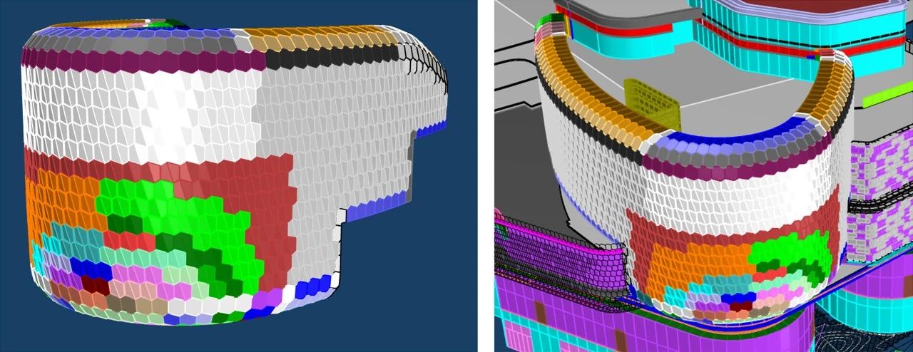 南裙樓船頭造型內(nèi)部鋼結(jié)構(gòu)均有扭轉(zhuǎn),要求拐角幕墻呈現(xiàn)雙曲面效果;屋檐幕墻設(shè)計(jì)圍繞龍鱗造型,分解為單片“六邊形”元素展開,拐角弧度造型對(duì)鋁板制造及安裝工藝要求極高。