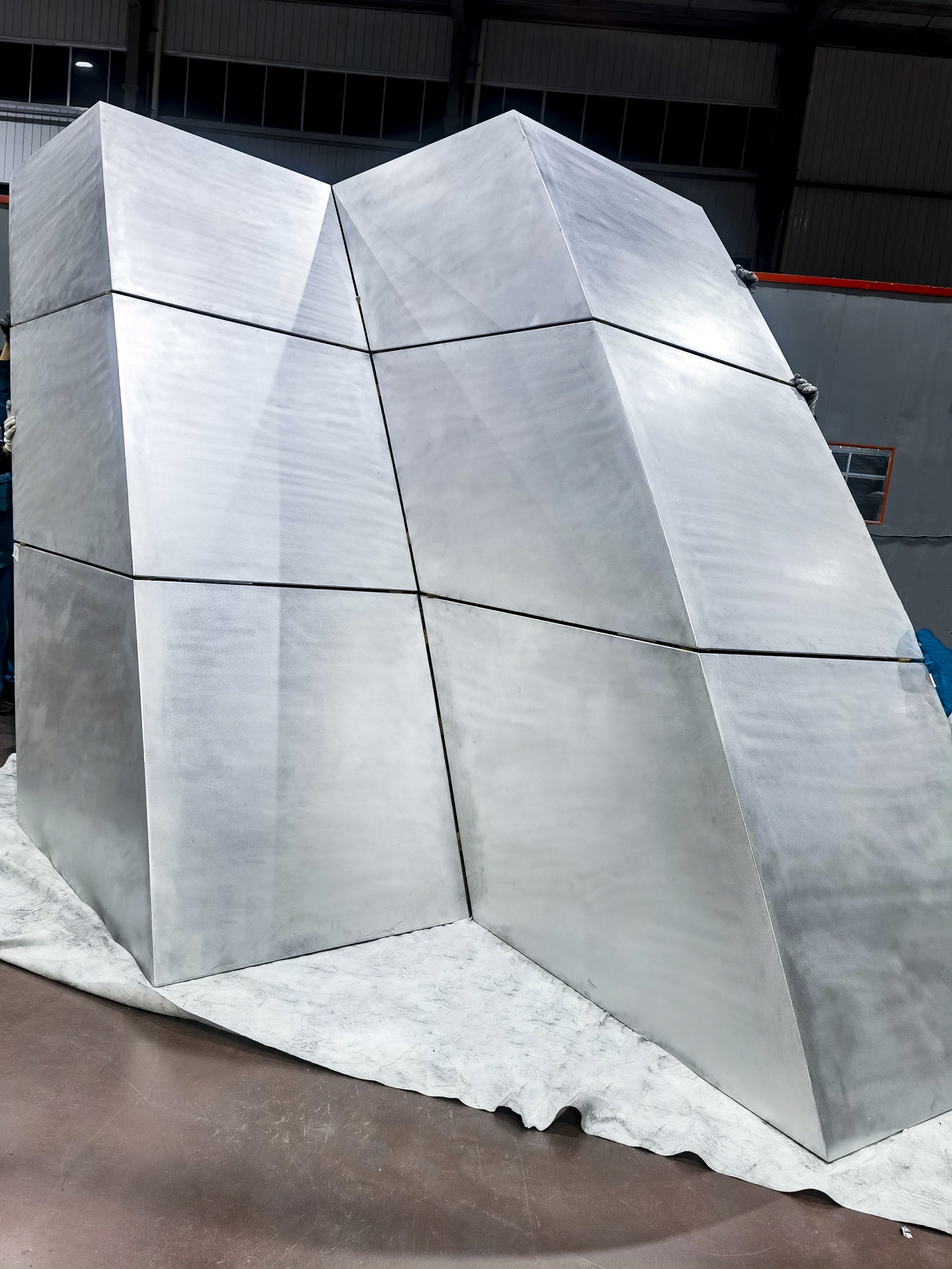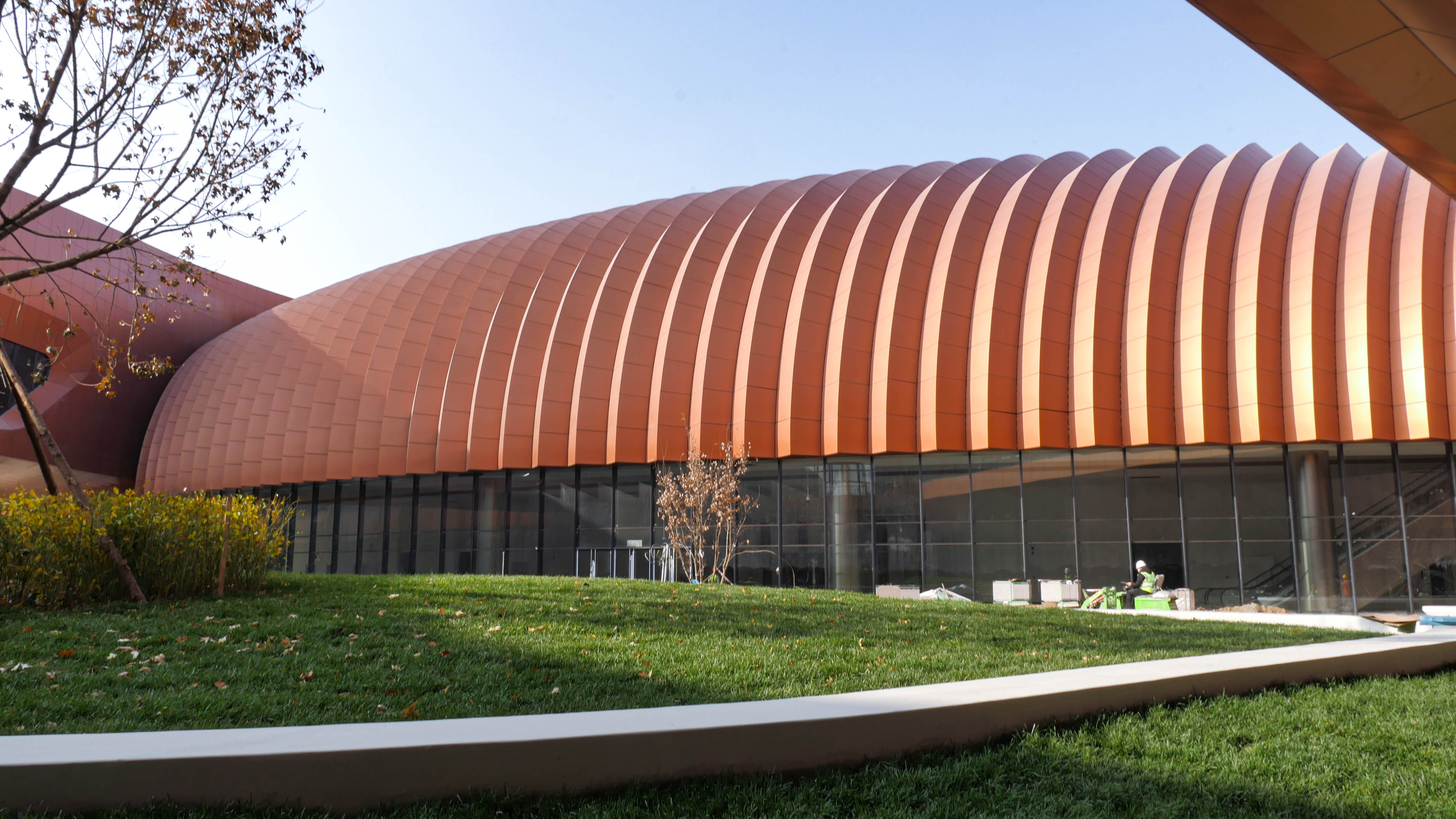 北京新國展“紫金絲帶”褶皺板,每件板上下、左右角度都有區(qū)別變化,左右呈發(fā)散式布局安裝,上下角度變化2.5度。尺寸偏差不超±1毫米,角度偏差不超過±0.5度,每件板都需專用模標(biāo)尺測(cè)量弧度。